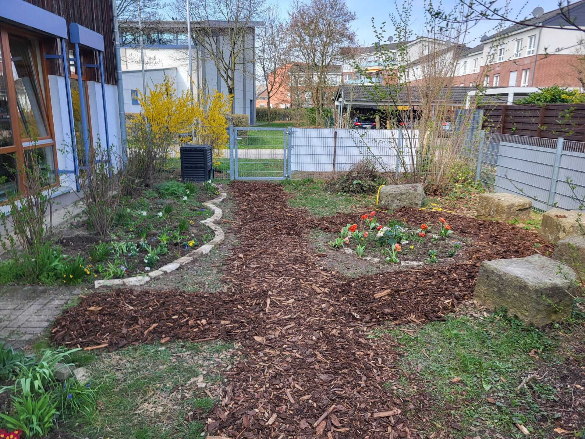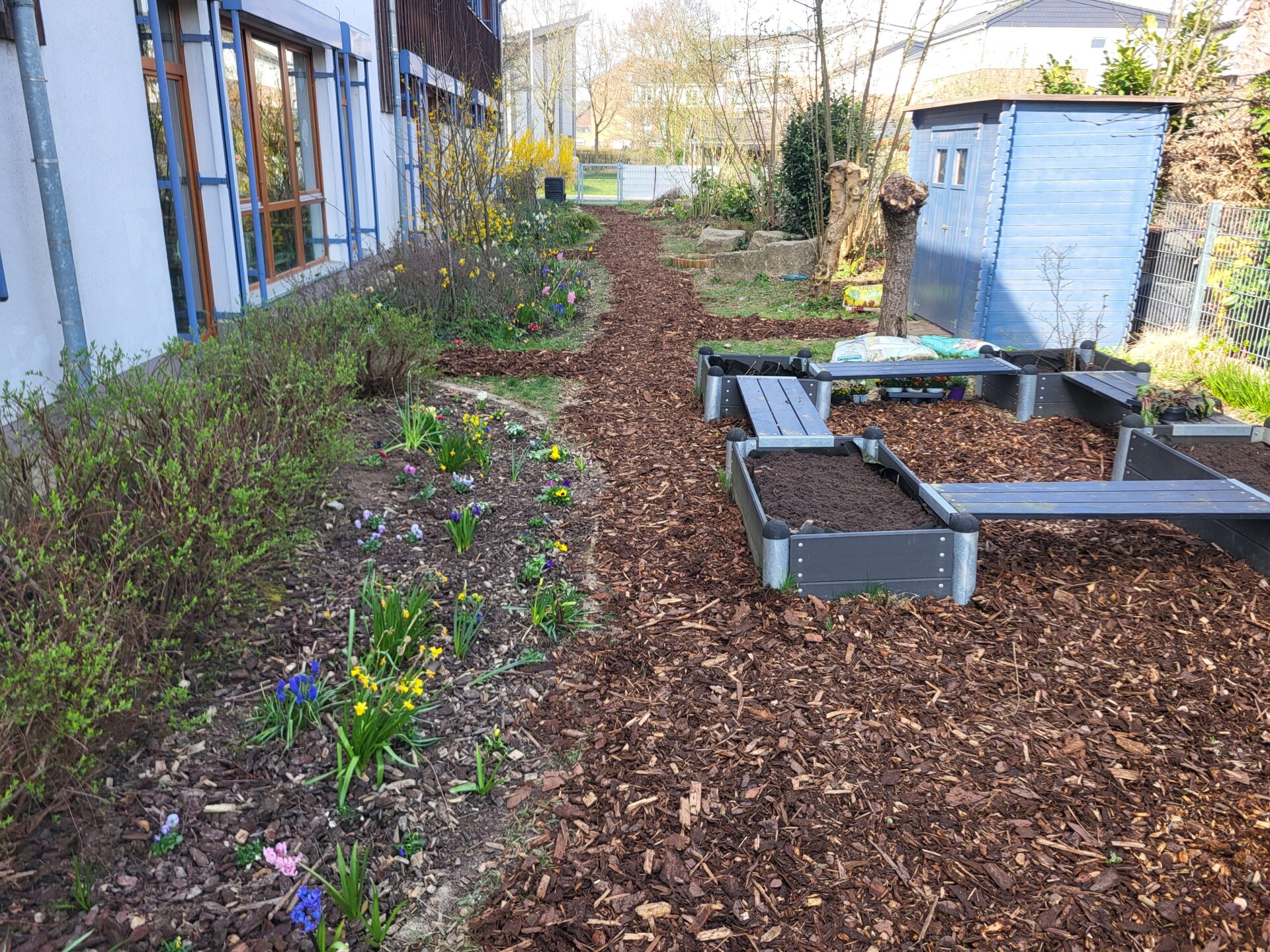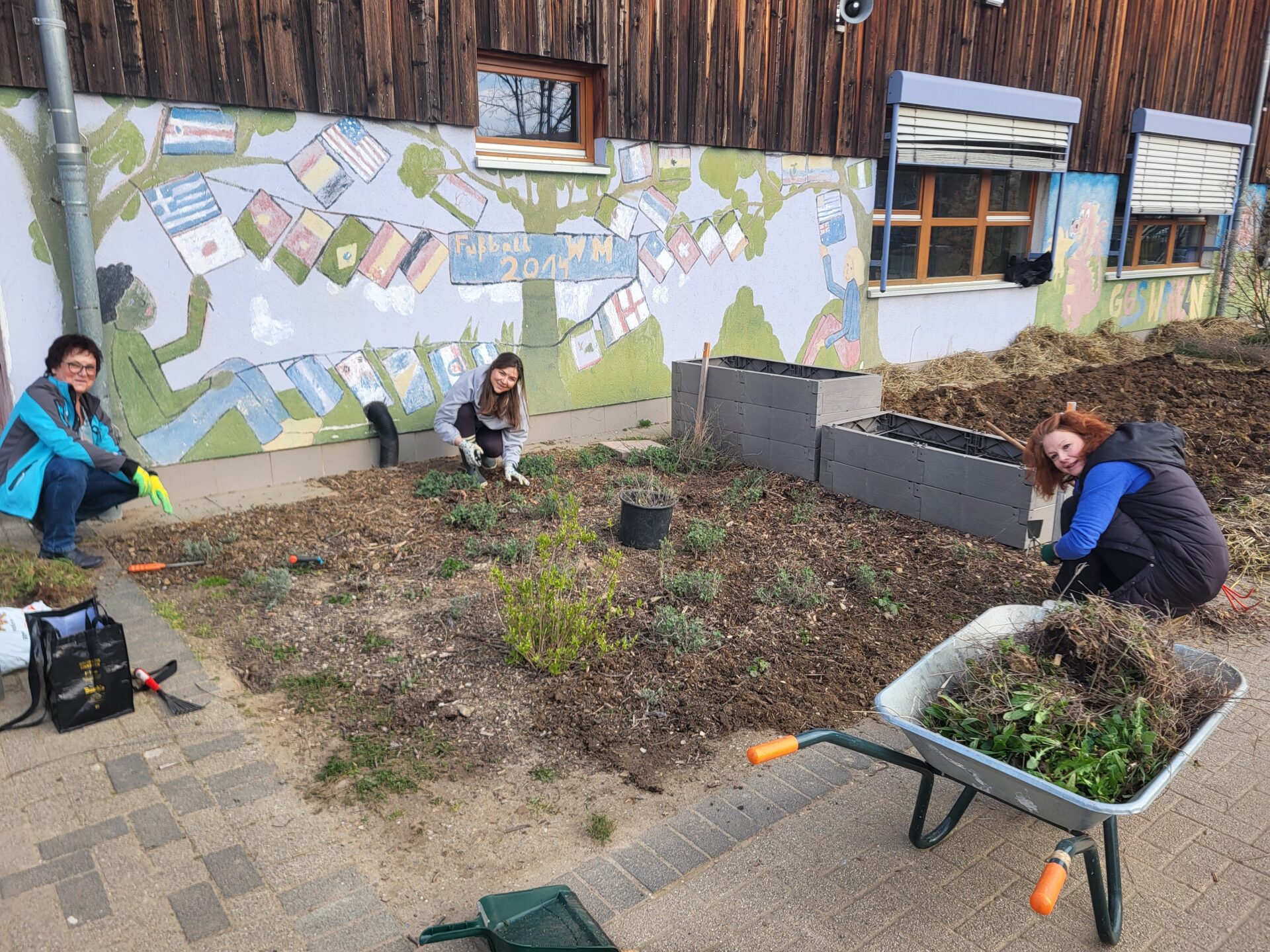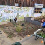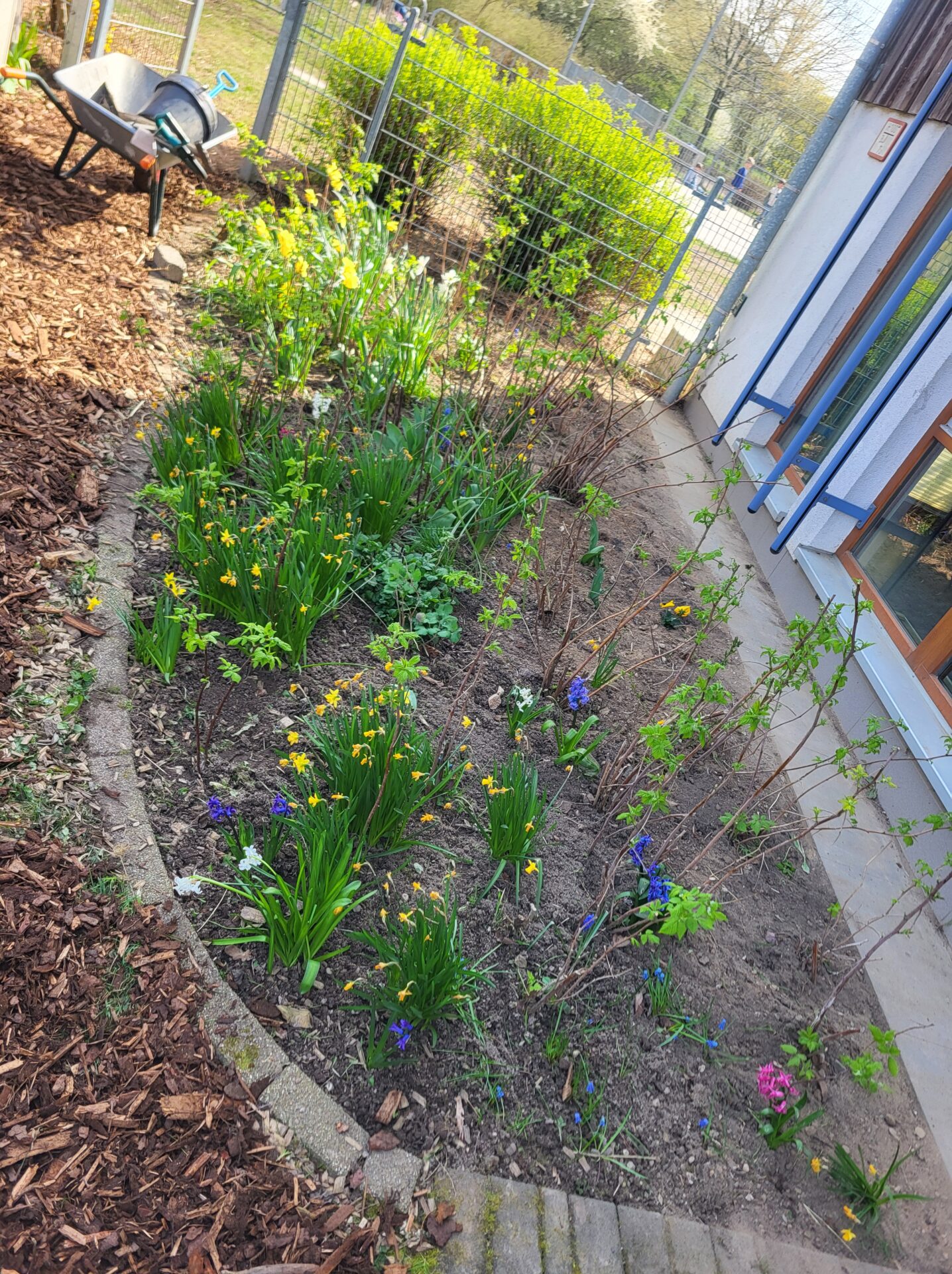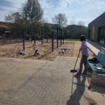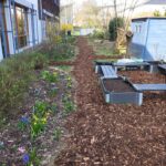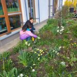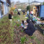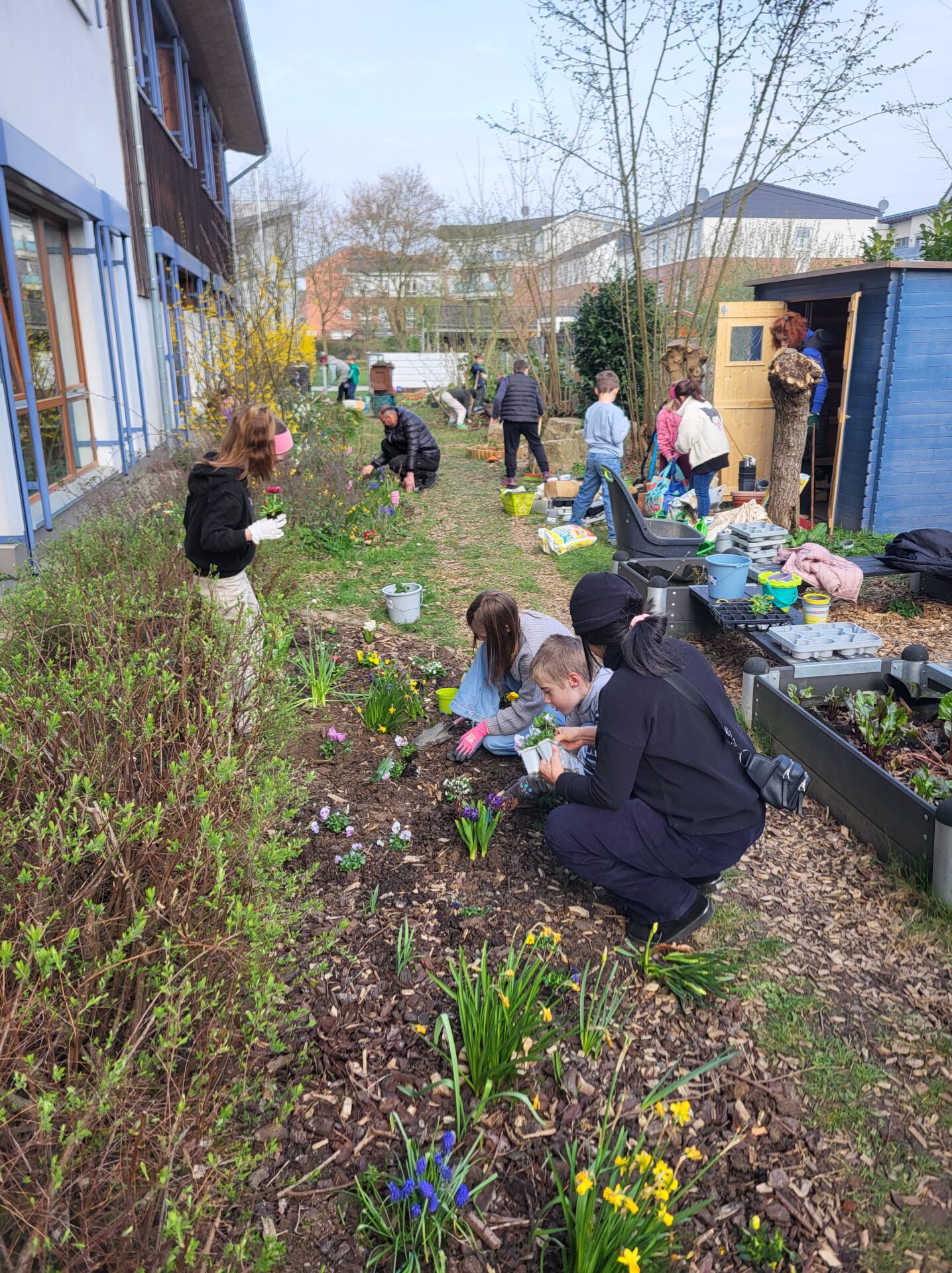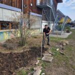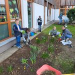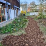 Dank vieler engagierter Eltern passiert auch auf dem Außengelände viel: Unser Igelhaus hat einen ruhigeren und einladenderen Platz im Garten gefunden. Die Gartenwege wurden mit Mulch bedeckt, damit der Garten auch bei schlammigem Wetter gut nutzbar bleibt. Außerdem wurde der Gartenschuppen ausgeräumt und neu organisiert, um einen besseren Überblick über alle Materialien zu schaffen – und ganz nebenbei wurde dabei auch die Zahl der Krabbeltiere im Häuschen reduziert. Der Bambus als invasive Pflanze wurde entfernt, und die Kräuter in der Kräuterschnecke wurden zurückgeschnitten. Viele Blumenbeete wurden von Unkraut befreit, Stauden zurückgeschnitten und neue Blumen gepflanzt.  Beide Gemüsegärten wurden umgegraben und der Boden aufgelockert, um ihn optimal auf unsere erste Pflanzung am 30. April im Rahmen der GemüseAckerdemie vorzubereiten. Der Schulhof ist nun gefegt, die Spieleausleihe ist aufgeräumt… es ist toll, was alles geschafft wurde.