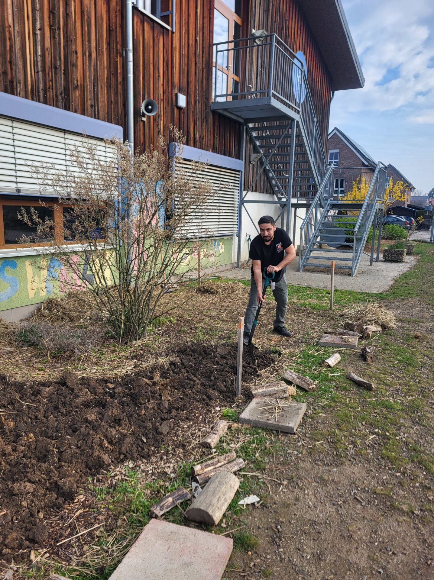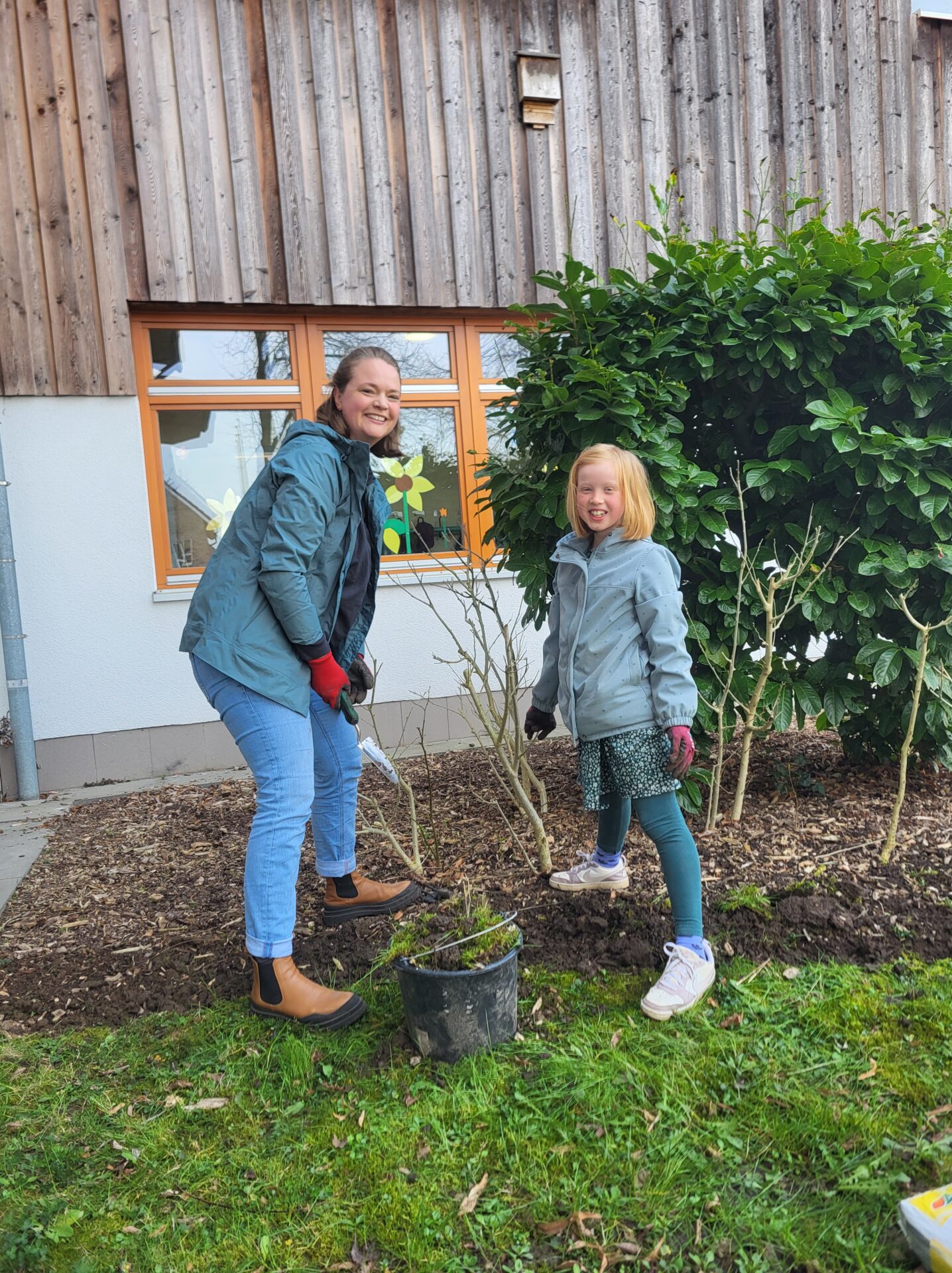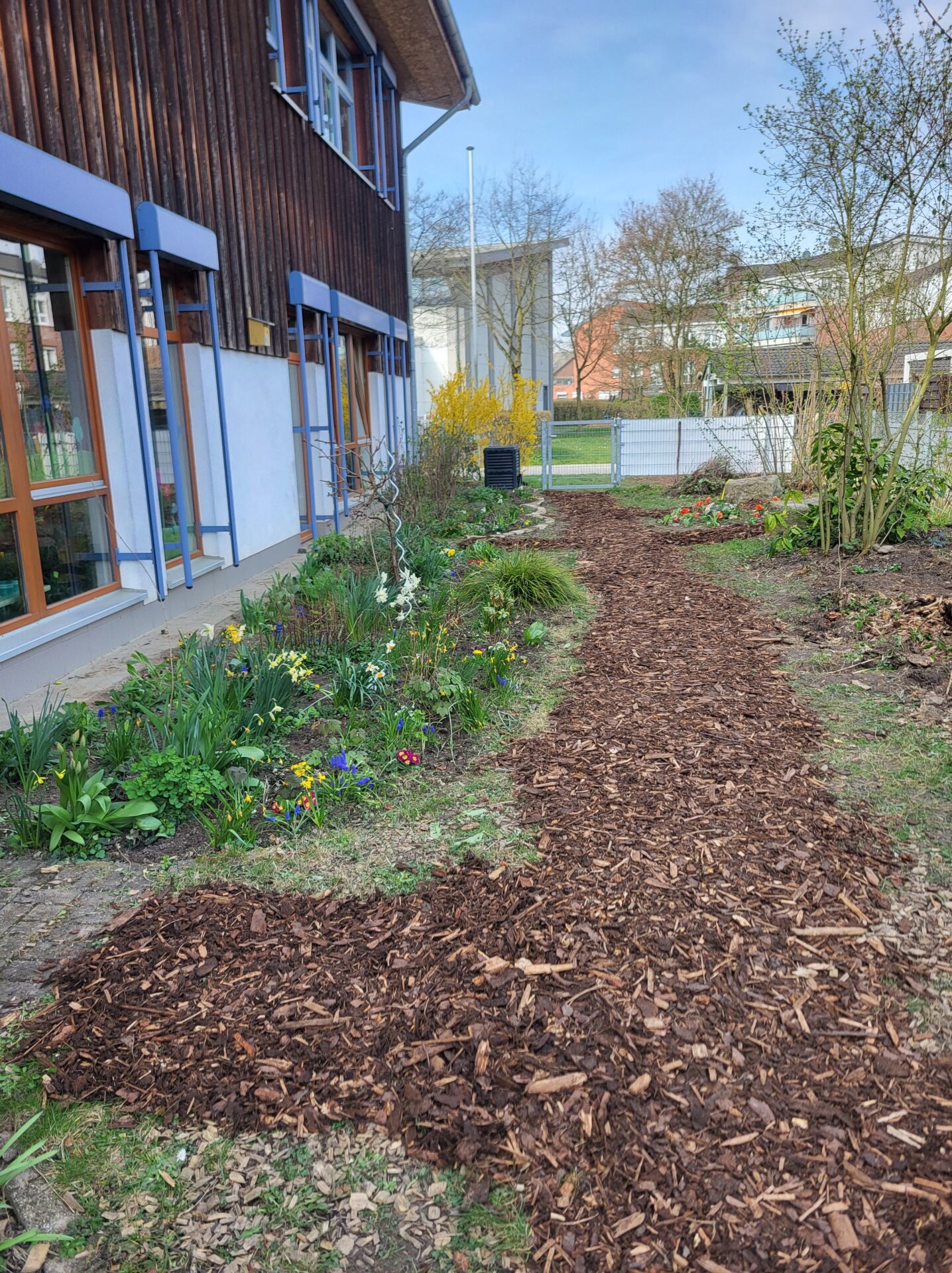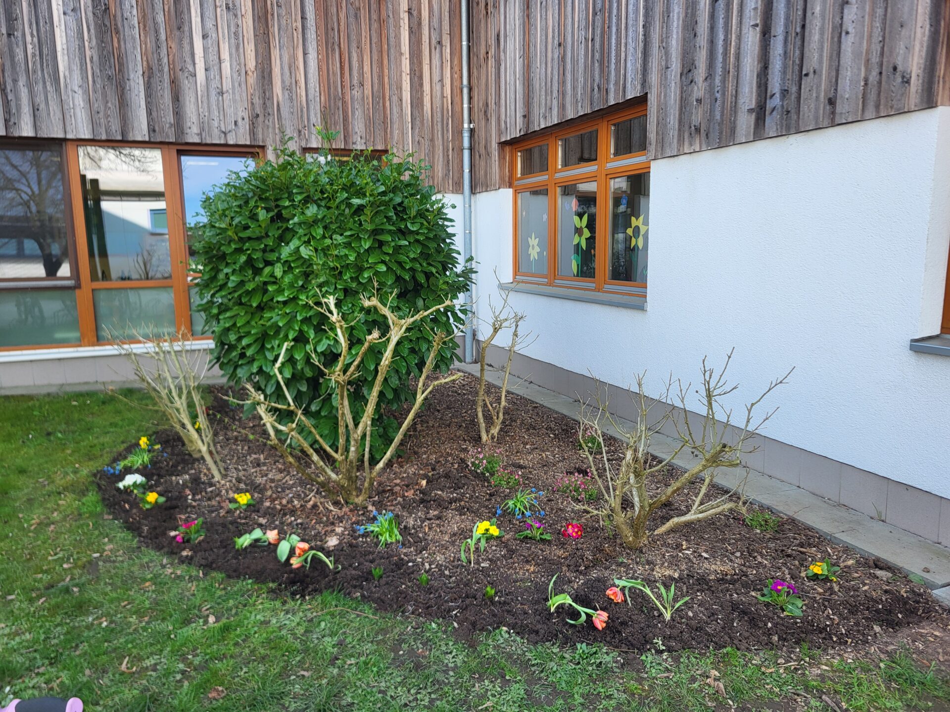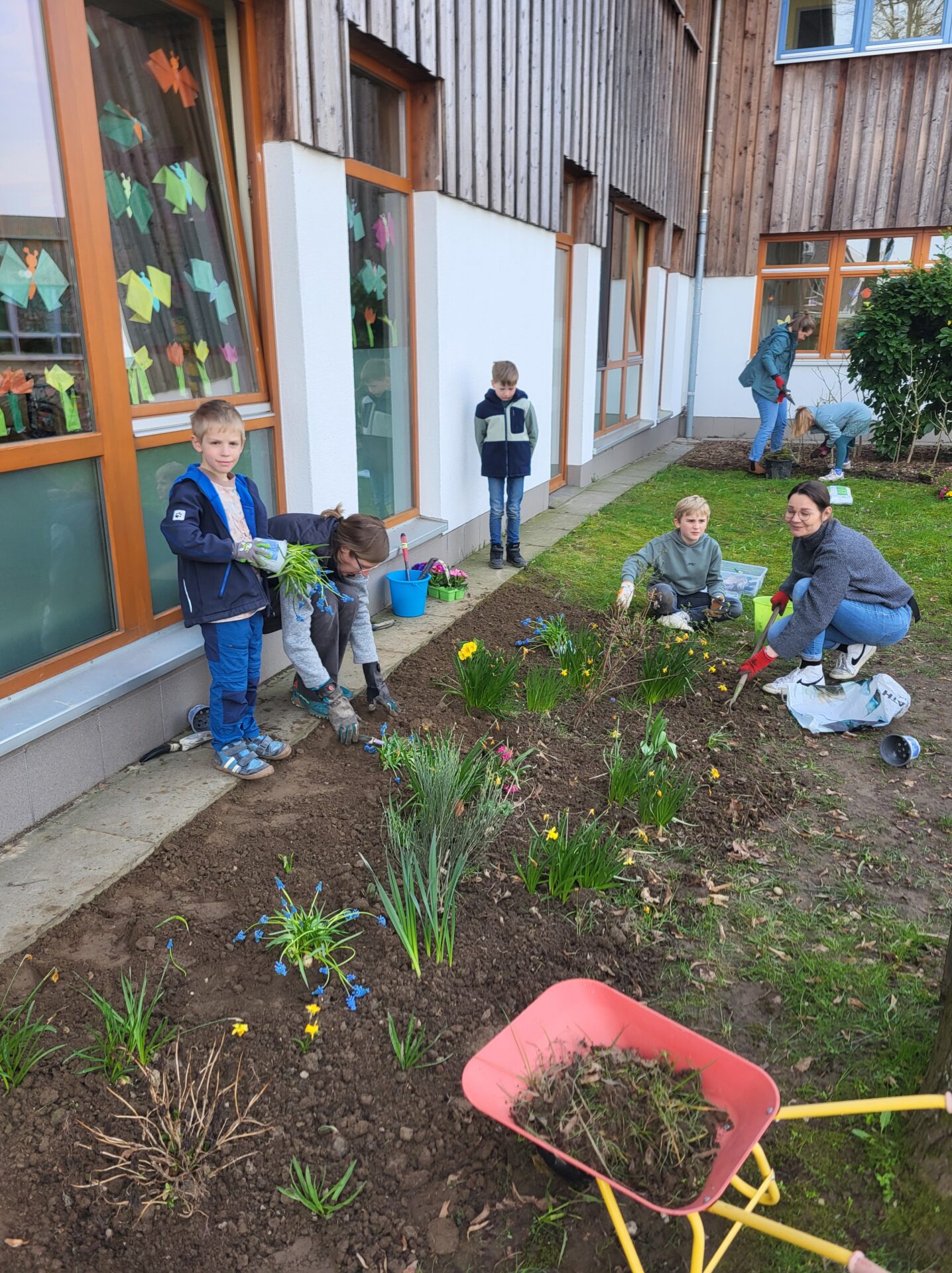 Dank vieler engagierter Eltern passiert auch auf dem Außengelände viel: Unser Igelhaus hat einen ruhigeren und einladenderen Platz im Garten gefunden. Die Gartenwege wurden mit Mulch bedeckt, damit der Garten auch bei schlammigem Wetter gut nutzbar bleibt. Außerdem wurde der Gartenschuppen ausgeräumt und neu organisiert, um einen besseren Überblick über alle Materialien zu schaffen – und ganz nebenbei wurde dabei auch die Zahl der Krabbeltiere im Häuschen reduziert. Der Bambus als invasive Pflanze wurde entfernt, und die Kräuter in der Kräuterschnecke wurden zurückgeschnitten. Viele Blumenbeete wurden von Unkraut befreit, Stauden zurückgeschnitten und neue Blumen gepflanzt.  Beide Gemüsegärten wurden umgegraben und der Boden aufgelockert, um ihn optimal auf unsere erste Pflanzung am 30. April im Rahmen der GemüseAckerdemie vorzubereiten. Der Schulhof ist nun gefegt, die Spieleausleihe ist aufgeräumt… es ist toll, was alles geschafft wurde.