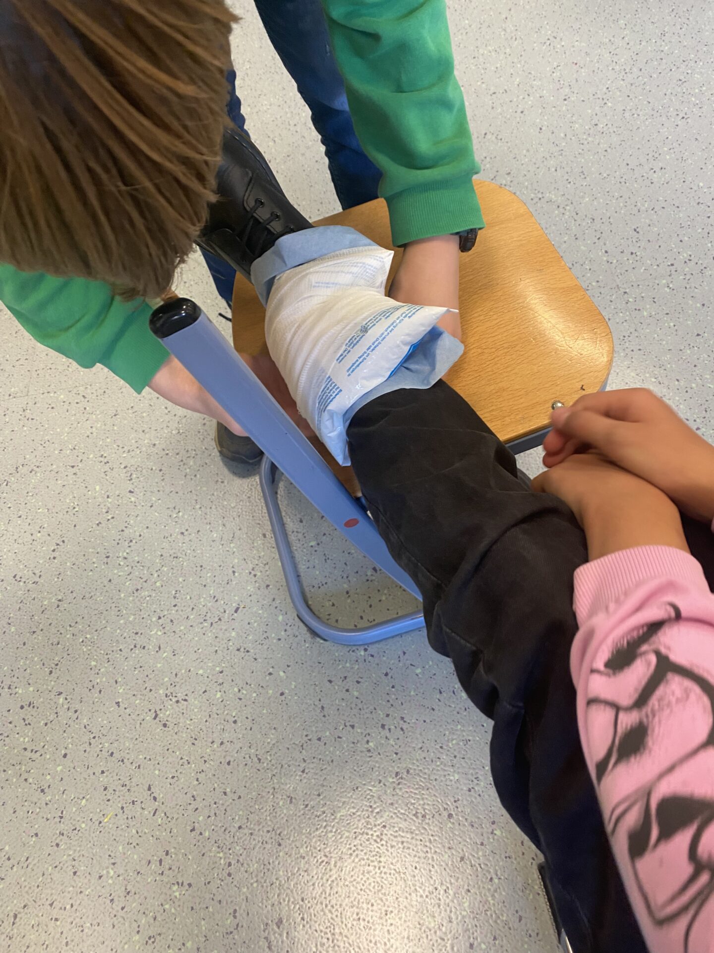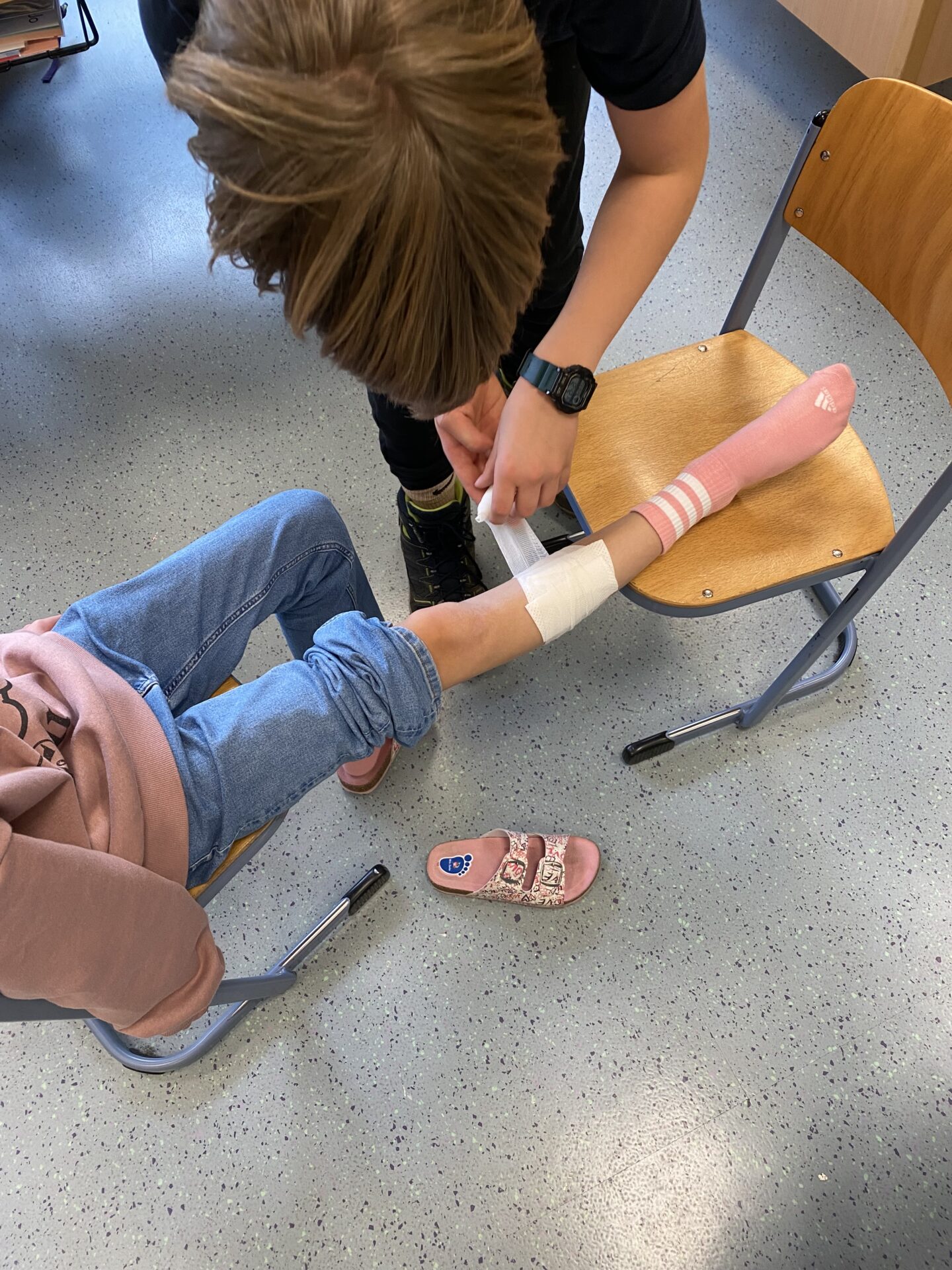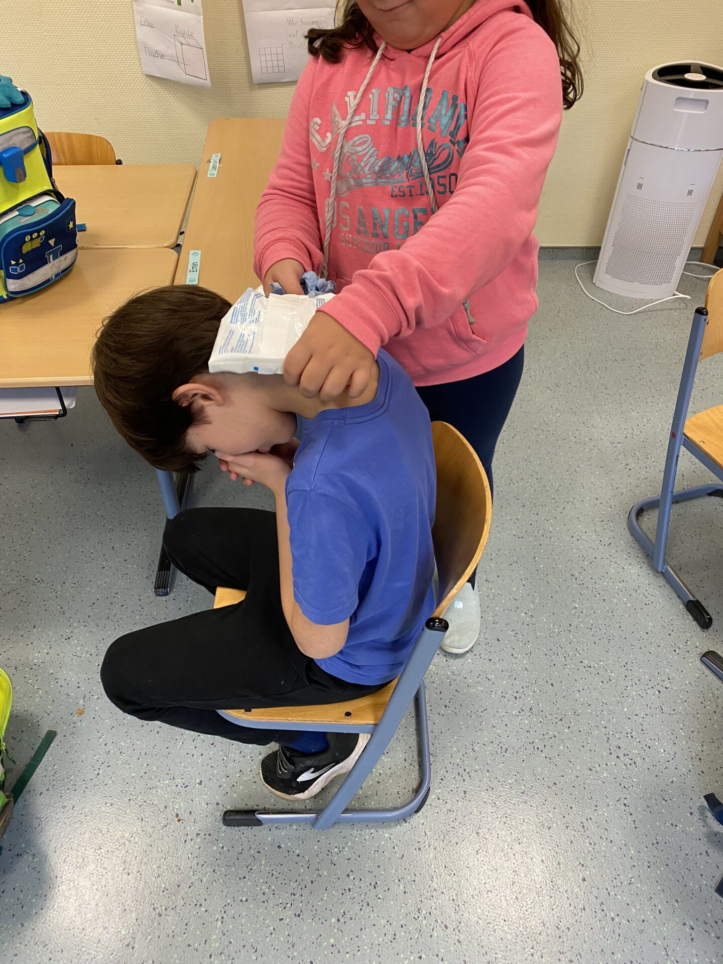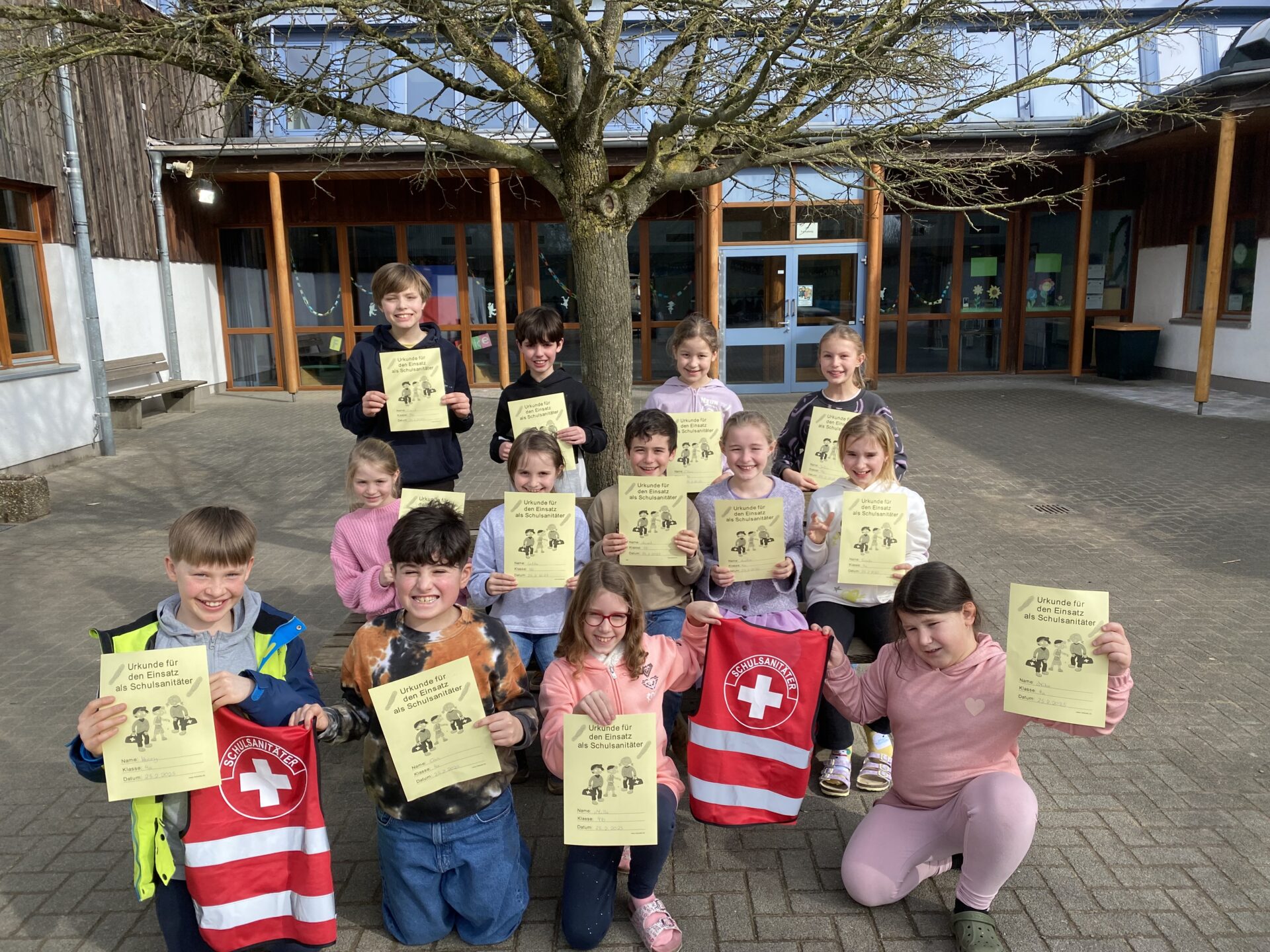 Am Ende der AG erhalten die Kinder eine Urkunde. In den Pausen gehen sie dann zu zweit über den Schulhof und helfen den Kindern bei kleineren Verletzungen. Durch die roten Sanitäterwesten sind sie gut erkennbar.