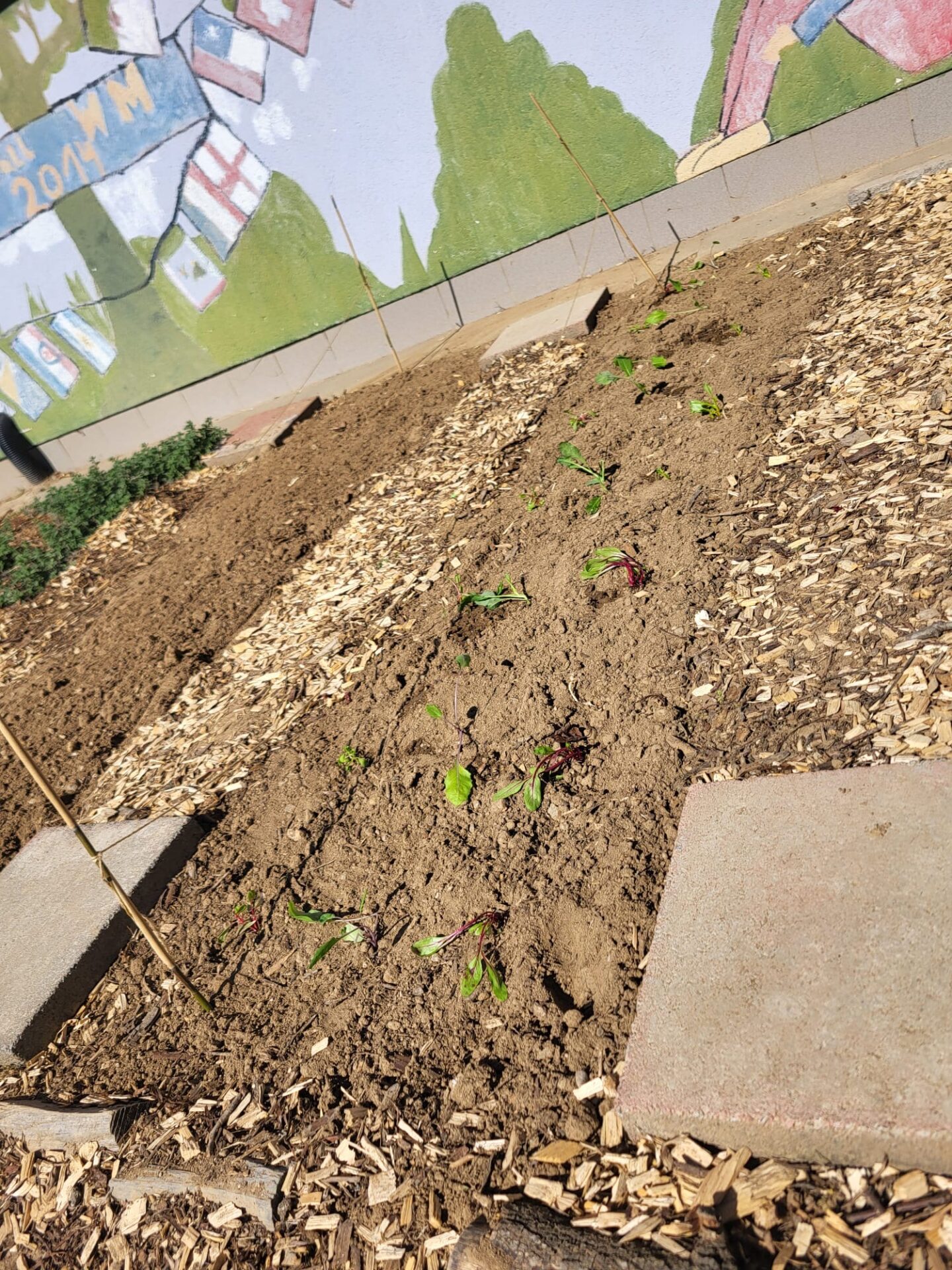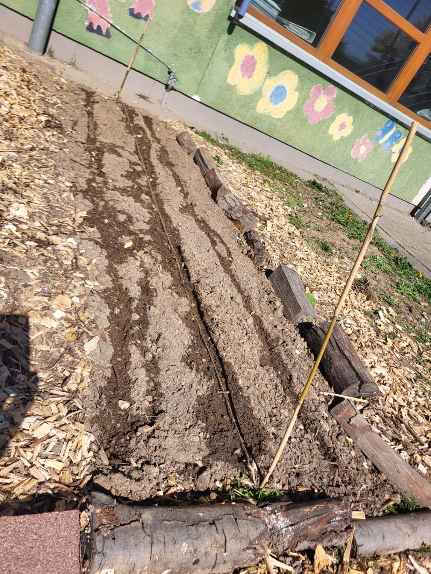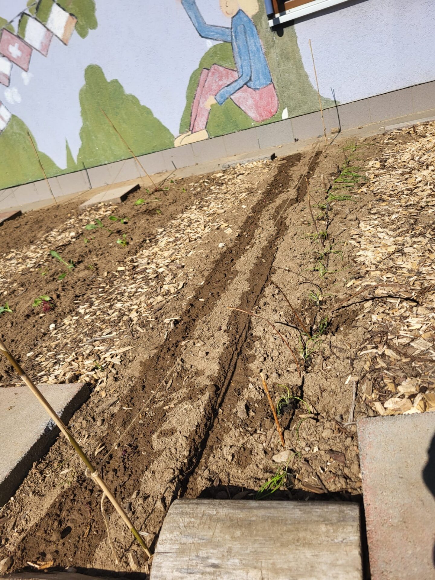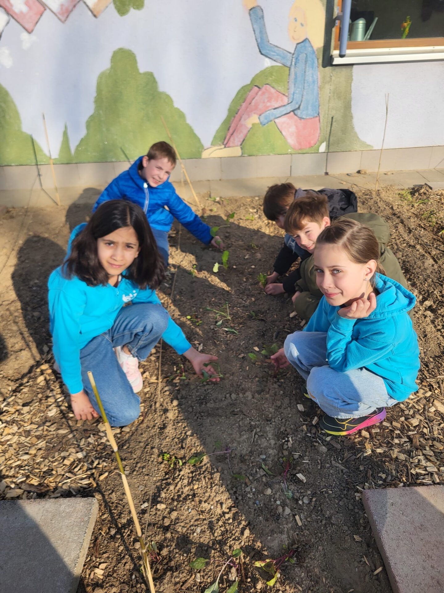 Heute wurden Möhren, Radieschen, Kohlrabi, Mangold, Kartoffeln, Palmkohl, Gemüsezwiebeln, Steckzwiebeln, Schwarzwurzel, Kresse und Rauke von Kindern des dritten Schuljahres gepflanzt.